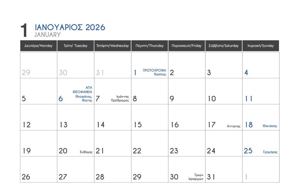 Στη μία σελίδα συνοπτικό τού κάθε μήνα με το εορτολόγιο και στην άλλη το συνοπτικό