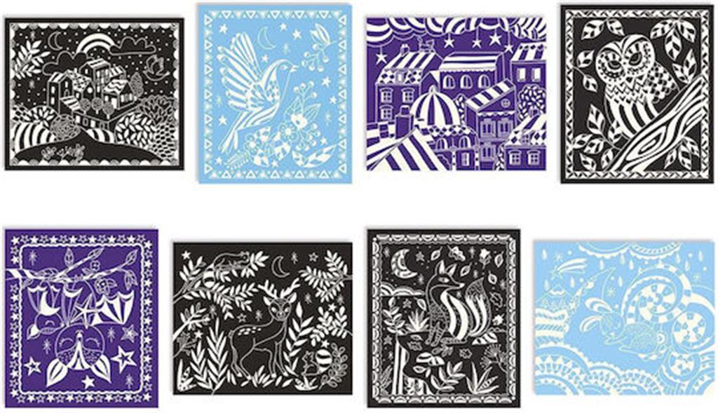 Α8 ξυστές κάρτες, 1 ξύλινο εργαλείο και 1 φυλλάδιο οδηγιών με μοντέλα. Η δραστηριότητα αναπτύσσει κινητικές δεξιότητες, θεωρητική σκέψη και πρακτική εφαρμογή.