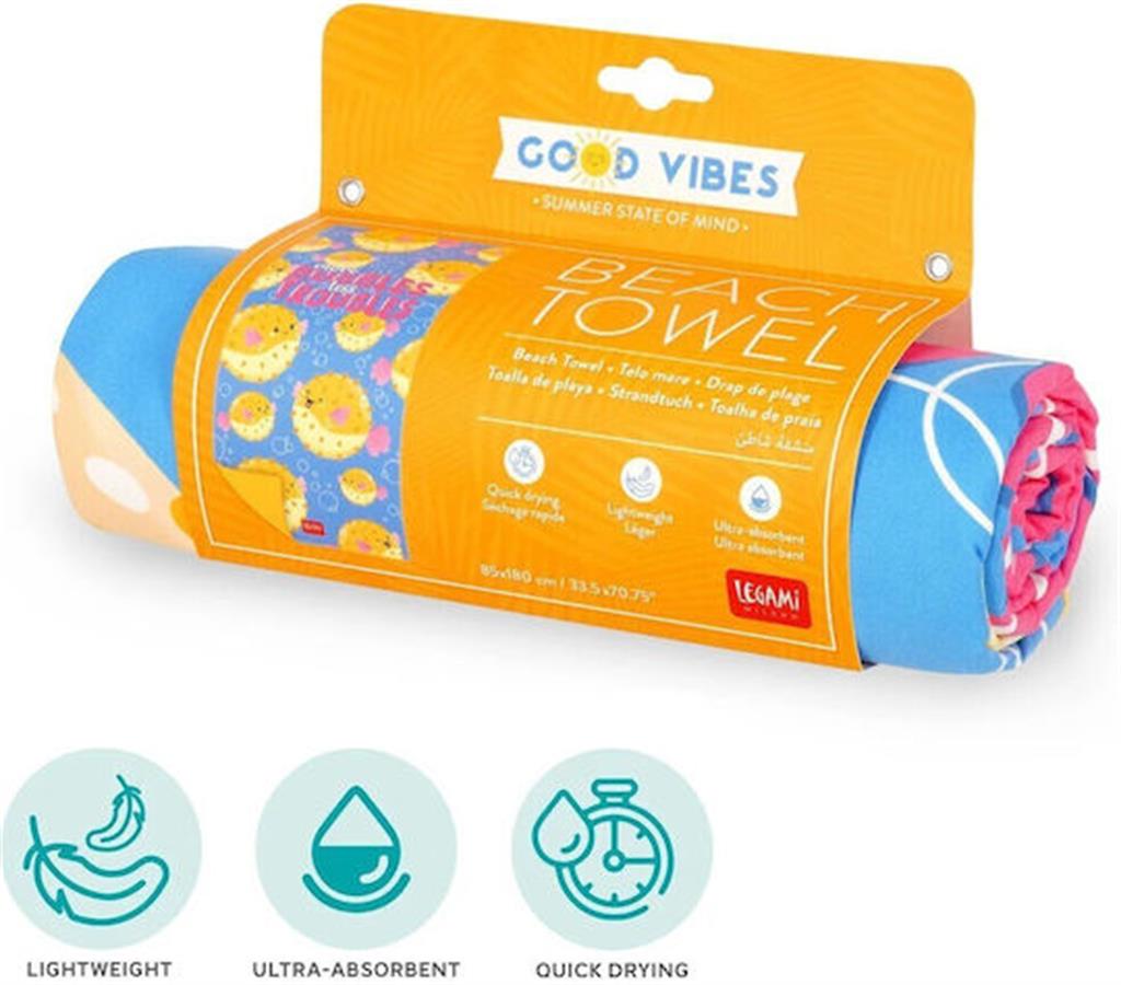 Διεκδικήστε τον χώρο σας στην παραλία με στυλ με την πετσέτα θαλάσσης Legami. Πρακτική και κομψή, η πετσέτα είναι συμπαγής, ελαφριά και διπλής όψης, επομένως δεν θα είναι κουραστική στη μεταφορά. Στεγνώνει γρήγορα και είναι εξαιρετικά απορροφητική, θα μπορείτε να κάνετε ηλιοθεραπεία, να χαθείτε στο καλοκαιρινό σας διάβασμα και να απολαύσετε τη θετική ατμόσφαιρα. Διαθέτει διασκεδαστική εκτύπωση στη μία πλευρά και χρωματικό μπλοκ στην άλλη.
