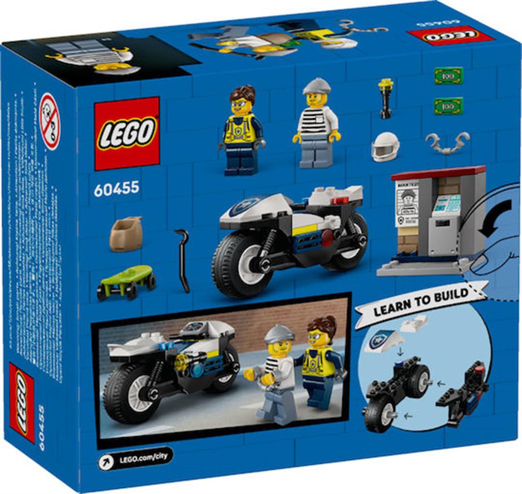 Εντυπωσιάστε τον μικρό σας ήρωα με αυτό το συναρπαστικό σετ παιχνιδιού LEGO City Police Motorcycle Chase (60455). Ιδανικό για μικρούς κατασκευαστές ηλικίας 4 ετών και άνω, διαθέτει μια απίθανη αστυνομική μοτοσικλέτα με φαρδιά ελαστικά, σκέιτμπορντ διαφυγής για τον κακοποιό και μίνι ATM που ανοίγει με ένα χαρτονόμισμα. Απλώς προσθέστε τις μίνι φιγούρες του αστυνομικού και του κακοποιού για άπειρες ώρες ευρηματικού παιχνιδιού και αφήγησης ιστοριών. Αυτό το εύκολο στην κατασκευή σετ παιχνιδιού με αστυνομική μοτοσικλέτα περιλαμβάνει ένα LEGO Τουβλάκι Εκκίνησης και εικονογραφημένο οδηγό. Ή μπορείτε να προσφέρετε στον καθημερινό σας ήρωα ένα συναρπαστικό ταξίδι δημιουργικότητας χρησιμοποιώντας τις ψηφιακές οδηγίες στην εφαρμογή LEGO Builder. Εδώ τα παιδιά μπορούν να ζουμάρουν και να περιστρέφουν μοντέλα σε 3D, να παρακολουθούν την πρόοδό τους καθώς κατασκευάζουν, και να εξερευνούν και να αποθηκεύουν άλλα σετ. Τα σετ κατασκευής LEGO City Police προσφέρουν περιπέτειες για κατασκευή και παιχνίδι γεμάτες δράση, για ατελείωτη δημιουργική διασκέδαση. Προσθέστε αυτό το σετ σε άλλα (πωλούνται χωριστά) από τη σειρά LEGO City για ακόμη μεγαλύτερες περιπέτειες! Το σετ περιέχει 65 τεμάχια.