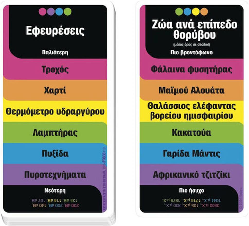 Περιλαμβάνει πύργο, 6 πακ, 60 κάρτες διπλής όψης και κανόνες παιχνιδιού.