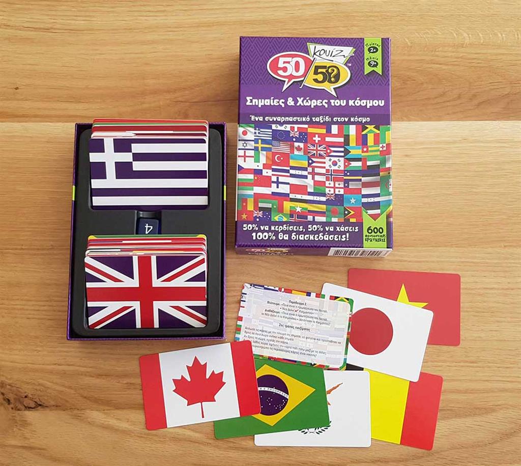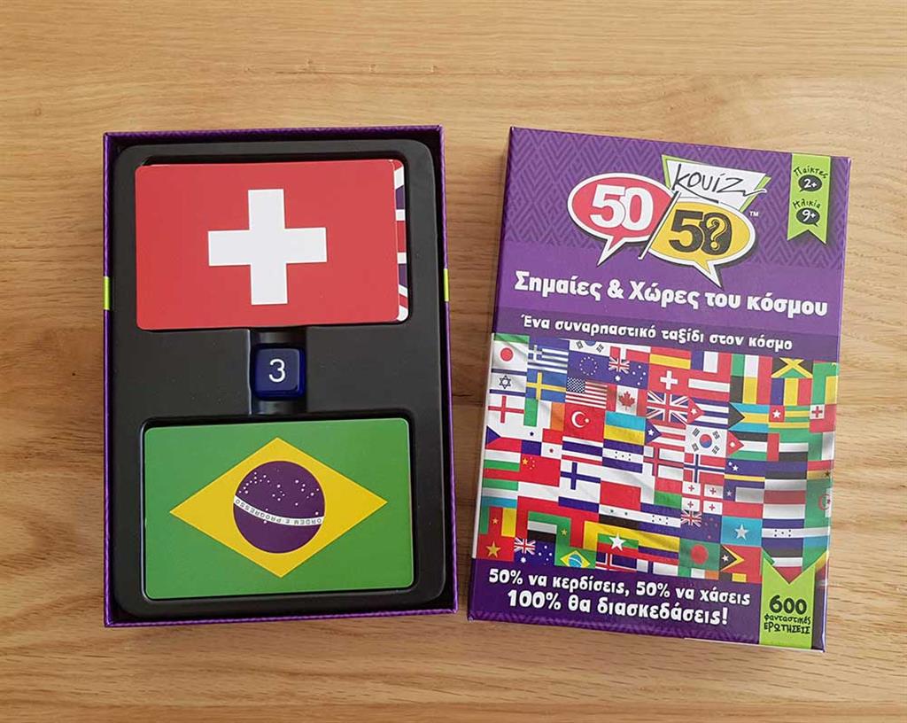 Ξέρεις όλες τις χώρες και τι σημαία έχουν; Πώς αλλιώς ονομάζεται ο Ισημερινός; Από πόσα νησιά αποτελούνται οι Μαλδίβες; Τέσταρε τις γνώσεις σου και συναγωνίσου τους φίλους σου με το νέο επιτραπέζιο ερωτήσεων 50-50 Κουίζ Σημαίες & Χώρες του Κόσμου! Με 600 ερωτήσεις που καλύπτουν ποικίλα θέματα, μαθαίνεις τις πιο ενδιαφέρουσες και αξιοπερίεργες πληροφορίες.