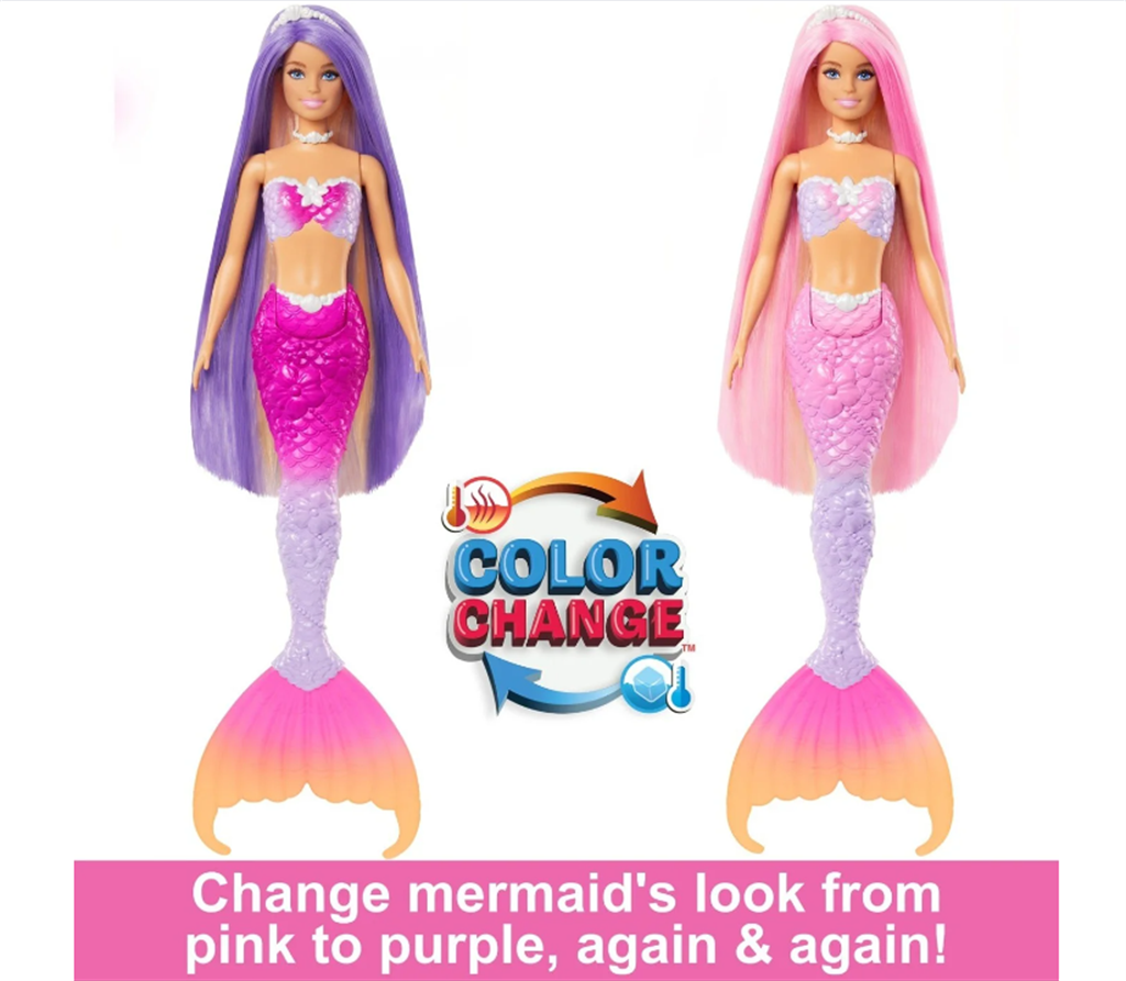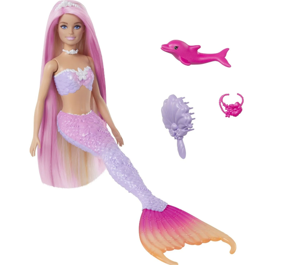 Αυτή η γοργόνα κούκλα Barbie μεταμορφώνει το χρόνο παιχνιδιού σε καθαρή μαγεία με τα χαρακτηριστικά αλλαγής χρώματος! Σαν να μαγεύτηκε από τις υποθαλάσσιες δυνάμεις, τα εξαιρετικά μακριά μαλλιά της γοργόνας, το γλυπτό μπούστο και η ουρά ombre μετατρέπονται από ροζ τσιχλόφουσκα σε ζωντανό μωβ και πάλι πίσω. Η Barbie 'Malibu' συνοδεύεται από αξεσουάρ styling, ένα πινέλο και ένα αξιολάτρευτο κατοικίδιο, που την κάνουν ένα φανταστικό δώρο για παιδιά από 3 ετών και άνω! Η κούκλα δεν μπορεί να κολυμπήσει ή να σταθεί μόνη της. Τα χρώματα και τα διακοσμητικά μπορεί να διαφέρουν.