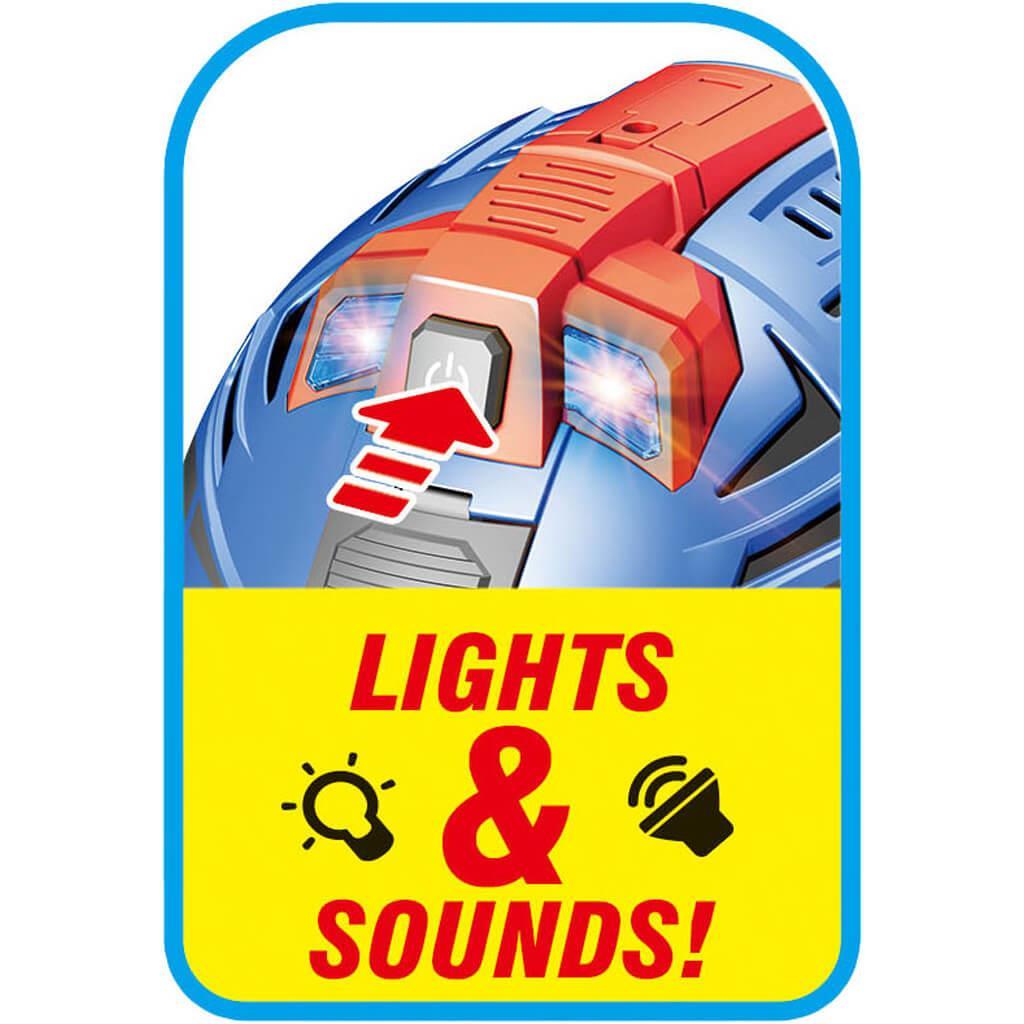 Το παρκινγκ κράνος σε μπλε χρώμα περιλαμβάνει δύο μεταλλικά αυτοκίνητα με φως και ήχο.