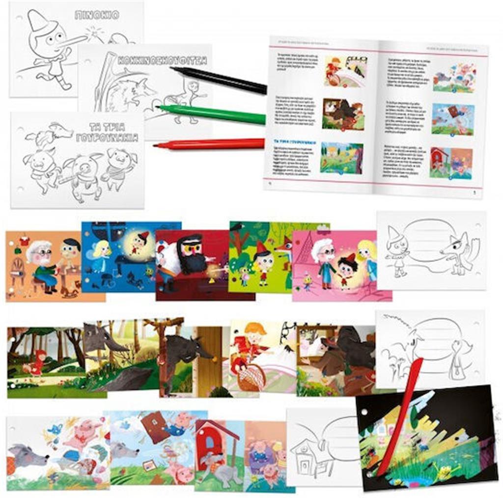 Δραστηριότητες χειροτεχνίας και αφήγησης. Ανακαλύψτε τα σχέδια που κρύβονται στις κάρτες, ξύνοντας με την κατάλληλη μύτη. Παρατηρήστε τις ακολουθίες των παραμυθιών και φτιάξτε τρία εξατομικευμένα βιβλία με αυτό το καταπληκτικό σετ!