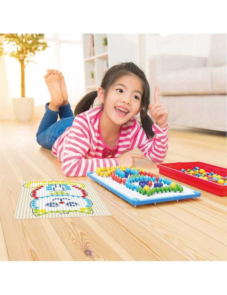 Δημιουργήστε υπέροχα μωσαϊκά με κουμπιά σε 6 διαφορετικά χρώματα.Ο διαφανής δίσκος έχει τρύπες όπου μπορείτε εύκολα να εισάγετε κουμπιά για να αναπαράγετε τις εικόνες που είναι τυπωμένες στις κάρτες στο πίσω μέρος του δίσκου.Περιλαμβάνει χερούλι που διευκολύνει τη μεταφορά του.Ηλικια 4+